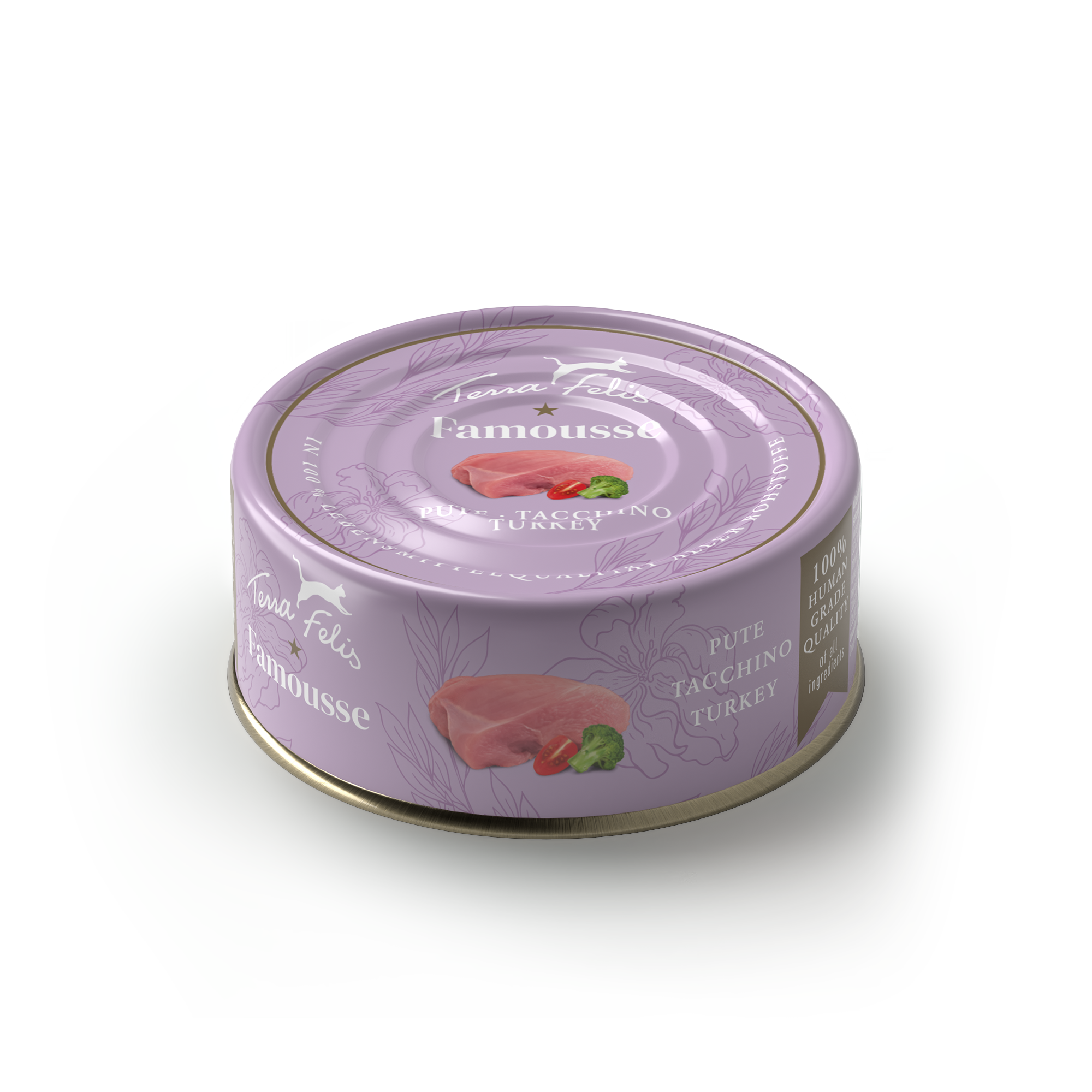 | 素材 | 七面鳥の心臓(49%)、七面鳥の肝臓(17%)、七面鳥の皮(14%)、七面鳥の筋肉(10%)、ブロッコリー(4%)、トマト、菜種油、キャットニップ、ミネラル類、グアーガム(増粘剤として使用)、カラギーナン(増粘剤として使用)、リン酸三ナトリウム |