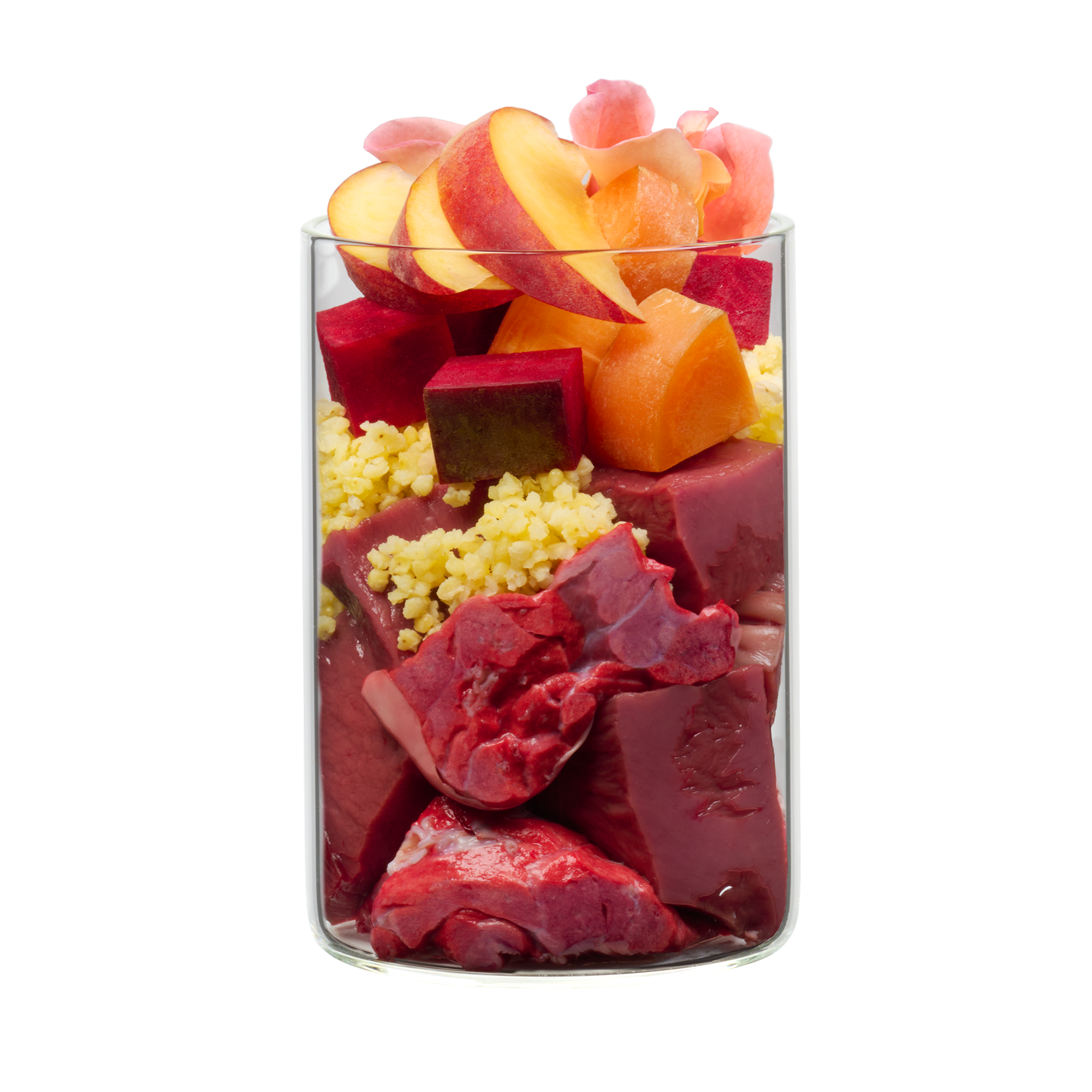 「イングリッシュローズ」は美しく均等のとれたイングリッシュローズガーデンへの旅へ誘うメニューです。伝統的な子羊肉を英国の伝統に基づいたレシピで仕上げ、豊かな風味と最高の香りに愛犬も喜びます。 上質なラム肉に高エネルギーのキビを加え、消化吸収性の高い食事を準備しました。シャキシャキとしたニンジン、新鮮なジャガイモ、健康的なビーツやパースニップ、リンゴや桃は、色とりどりの多様性と自然の栄養素を与えます。高品質の菜種油、ビタミンが豊富なローズヒップ、消化の良いココナッツ粉も、このバラの食事のハイライトです。香り高いセージ、パセリ、バジル、そしてもちろん繊細なバラの花びらが特別な香りとイギリスの風味を与える特別なメニューです。