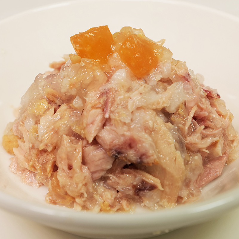 マグロとパパイヤの組み合わせでオメガ3脂肪酸、消化酵素とビタミンを補給、嗜好性と水分補給に配慮したジュレ仕立てのレシピです。
